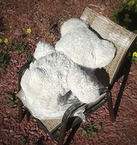2. Teddy Yeti likes to LAX for a little while in the plastic bag, as the BAking soda does its GOOD works, abSORBing ALLLL the fur-matting OILs an DIRty SMELLs!!