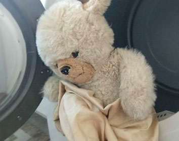 Teddy Yeti Pro Tips: Cover SENStive plastic eyes and noses with ay soft MICROFIBER BLINDFOLD to make the dryer less SCAry and to reDOOse FWICKshin, DENTS an SCRATCHes! Tie up your pillow case TIGHT! so you do NOT fall out during the ride! You may also TOSS in ay DRYer sheet for ADDed FWESHness!